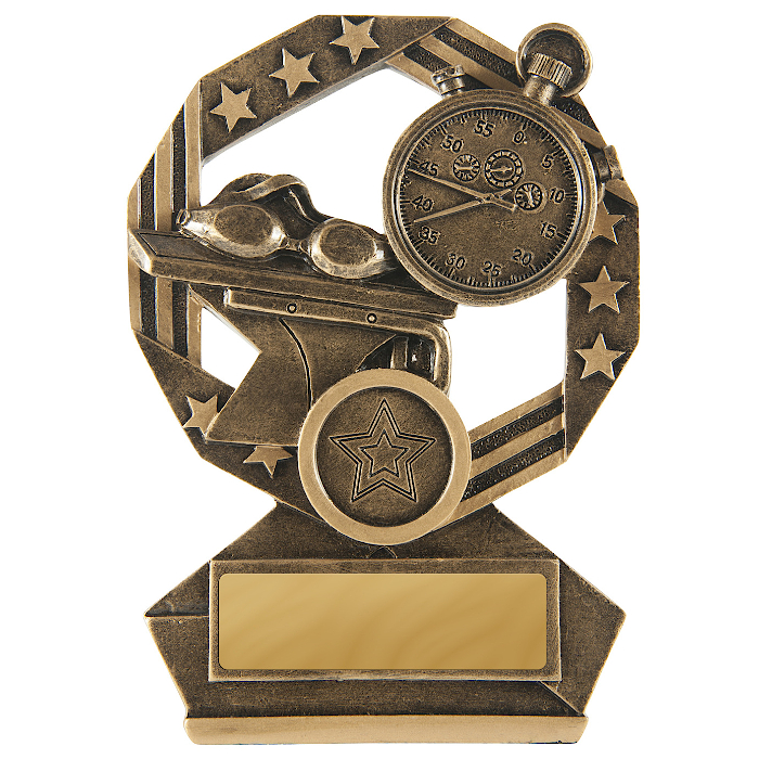 The Bronzed Aussie swimming trophy offers wonderful value – perfect for your bulk club orders. The design features googles, board and stopwatch framed by a stripe/star pattern. Finished in bronze/gold colour. These swim trophies are available in 3 sizes with space for your free club logo centre and free engraving.