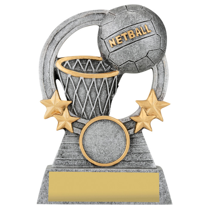 The Comet Netball trophy showcases a Netball theme with a star surround. Finished in antique silver colour with gold highlights. These great priced trophies are available in 3 sizes and include your free club logo centre and free engraving on a gold metal plate.
