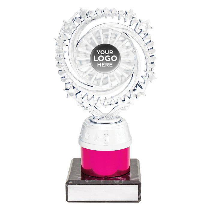 The beautiful Cosmic Column trophy presents a dazzling star spangled design on top of a sleek marble base. These affordable trophies are available in 5 sizes and 8 different colour combinations. Price includes your free engraving and free logo centre. Any image can be added as the logo centre – whether it be a club or business logo or design your own!