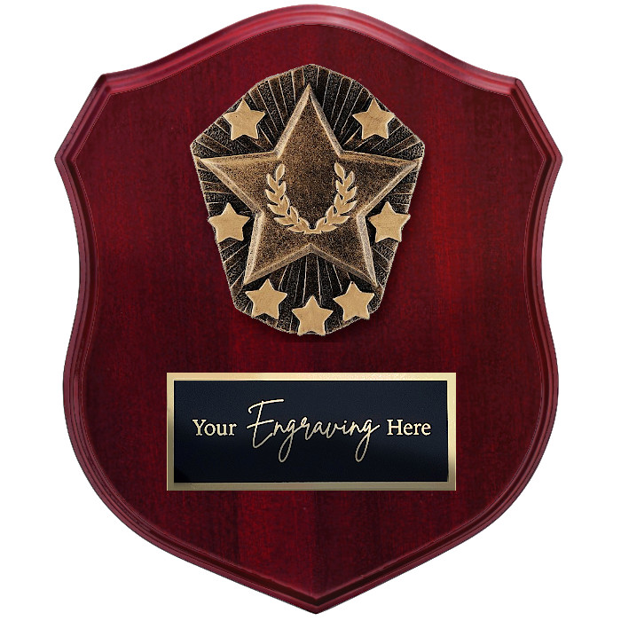 The Cosmos Shields are one of our most popular awards. Featuring a 3D antique gold motif that is superbly finished with great attention to detail – mounted on a premium quality gloss rosewood shield. Your free engraving is presented beautifully on a metal plate below the motif. The reverse side of the shield features both a wall mount and desk stand option.