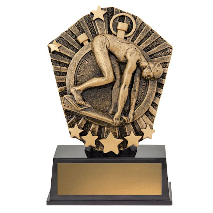The Cosmos Super Mini Swimming Female trophy offers an affordable alternative that retains the brilliant design elements of the larger Cosmos sizes. Featuring a superbly crafted 3D theme motif, finished in classic antique gold colour with a black base. The price includes free engraving on a gold metal plate. These incredible value swimming trophies are available in the following sizes: 120mm.