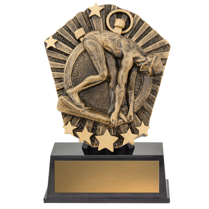 The Cosmos Super Mini Swimming Male trophy offers an affordable alternative that retains the brilliant design elements of the larger Cosmos sizes. Featuring a superbly crafted 3D theme motif, finished in classic antique gold colour with a black base. The price includes free engraving on a gold metal plate. These incredible value swimming trophies are available in the following sizes: 120mm.