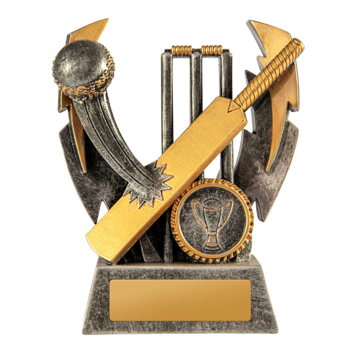 The Double Lightning Strike is one of our favourite cricket awards! Featuring the iconic cricket elements of ball, bat and wickets against a lightening strike background. With an affordable price tag this trophy is perfect for your bulk team and club participation awards. Finished in classic antique silver and gold. These cricket trophies are available in 3 sizes with space for your free club logo centre and free engraving.