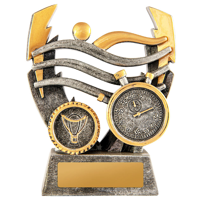 The Double Lightning Strike swimming trophy is one of our favourite swim awards! Featuring the iconic elements of ball and boot against a lightening strike background. With an affordable price tag this trophy is perfect for your bulk team and club participation awards. Finished in classic antique silver and gold. These swim trophies are available in 3 sizes with space for your free club logo centre and free engraving.