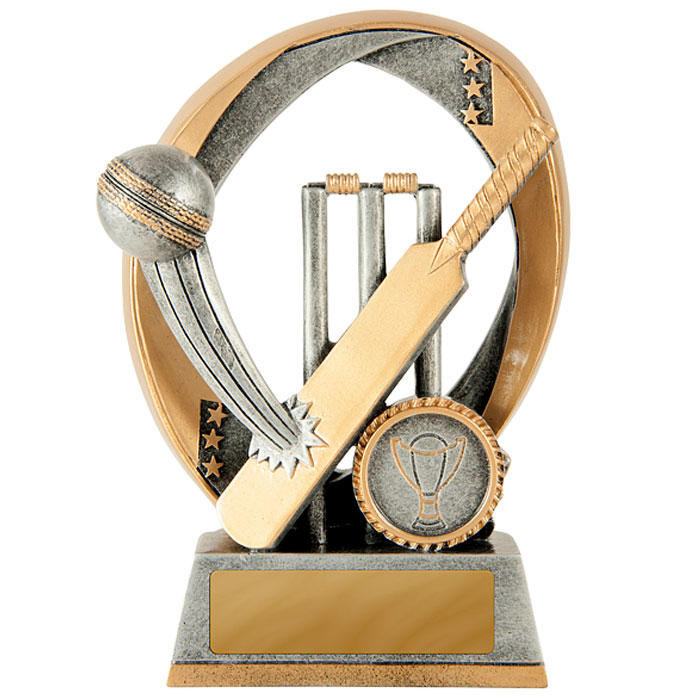 The Elliptical Cricket trophy offers super value, perfect for your bulk club orders. Its design features wickets with bat and ball and a unique elliptic background. Finished in antique silver and gold colour. These cricket trophies are available in 3 sizes with space for your free club logo centre and free engraving.
