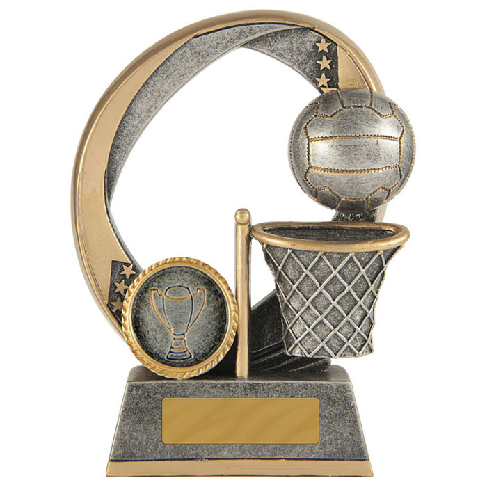The Elliptical Netball trophy features the iconic net and ball against an elliptical shaped star inspired background – finished in antique silver and gold colours. These well priced netball trophies are available in 3 sizes and include space for your free club logo centre and free engraving.