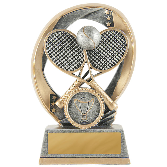 The Elliptical tennis trophy offers fantastic value, perfect for your bulk club orders. Its design features a tennis theme against a unique elliptic background. Finished in antique silver and gold colour. These tennis trophies are available in 3 sizes with space for your free club logo centre and free engraving.