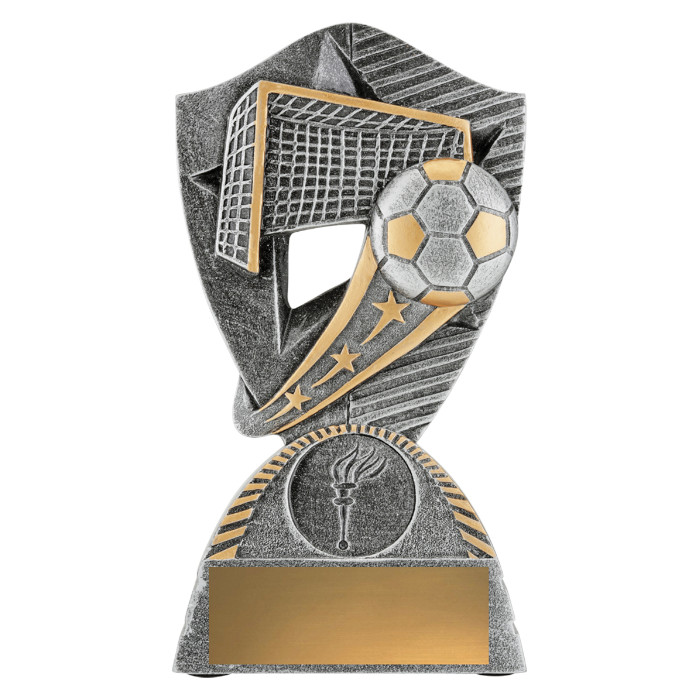 The Gambit Football / Soccer trophy showcases a football theme against a cut-out star backdrop. Finished in antique silver colour with gold highlights. These trophies are available in 3 sizes and include your free club logo centre and free engraving on a gold metal plate.