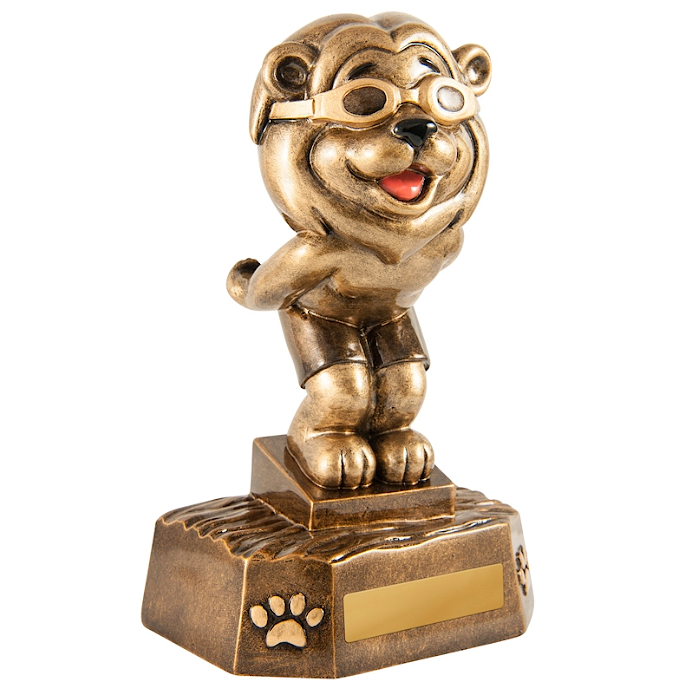 The Lion swimming trophy is a fun award choice for kids and junior players. The mini trophy features a lion character and is finished in a classic trophy gold colour combination. Includes space for your free engraving on a gold metal plate.