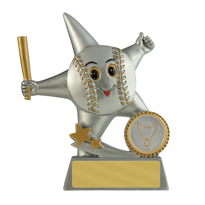 The Little Star Baseball / Softball trophy is one of our most popular awards for kids! Featuring a groovy little star character, these fantastic value trophies will bring a big smile to all of your players faces! Perfect for your “Player of the Week” award or even as a participation award for every team member. Available in 1 size and includes space for your free club logo and free engraving on a gold metal plate.