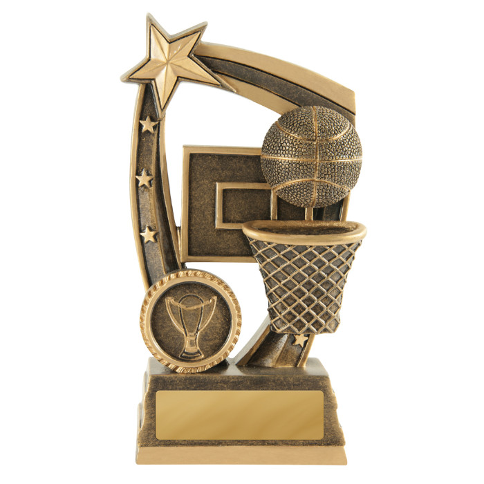 The Maverick Basketball trophy provides excellent value for your team or club participation orders. A design that features basketball theme on a unique star background. Finished in antique gold colours. These trophies are available in 3 sizes with space for your free club logo centre and free engraving.