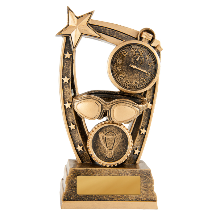 The Maverick swimming trophy provides excellent value for your team or club participation orders. A design that features googles and stopwatch on a unique star background. Finished in antique gold colours. These swim trophies are available in 3 sizes with space for your free club logo centre and free engraving on a gold metal plate.