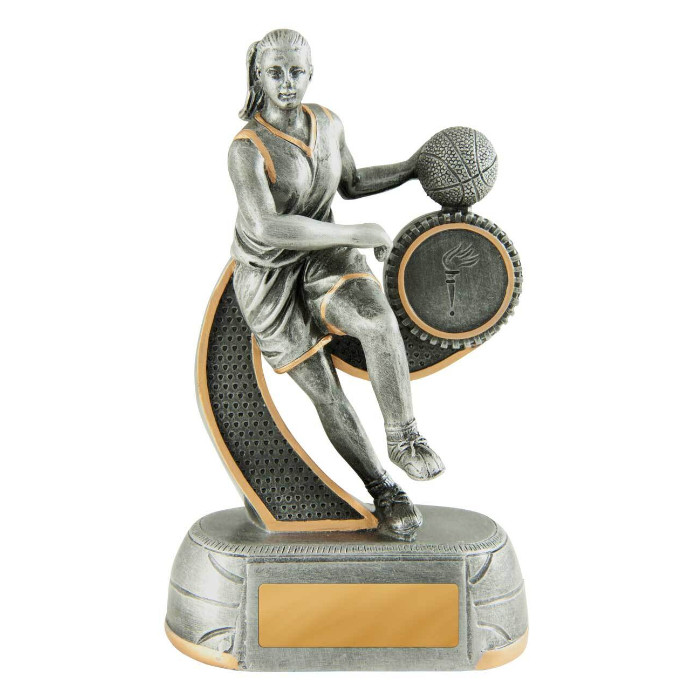 The MegaStar Basketball series feature a player with ball in action. Perfect for various award categories. Finished in classic antique silver colour with gold highlights. These trophies are available in a range of sizes (male or female) and include your free club logo centre and free engraving.