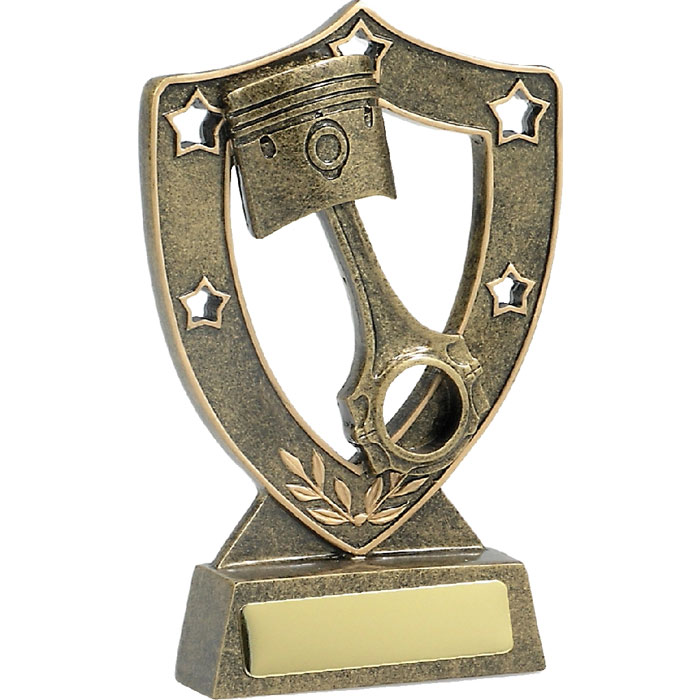 The Motorsport Piston Shield presents a classic wreath and shield inspired design. This affordable and popular award choice offers a versatile theme award that is perfect for a wide range of events. These motorsport trophies are available in 3 sizes and include free engraving on a gold metal plate.