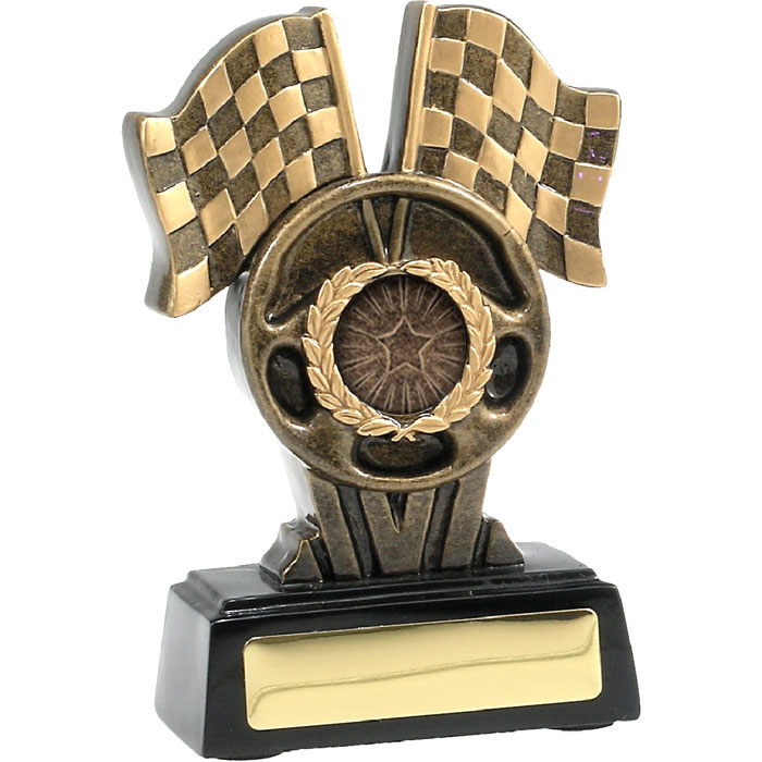 The Motorsport Racing Flags trophy features the iconic victory flags and steering wheel. Finished in traditional antique gold colour scheme upon a black base. These motorsport trophies are available in 3 sizes and include space for your free logo and free engraving on a gold metal plate.