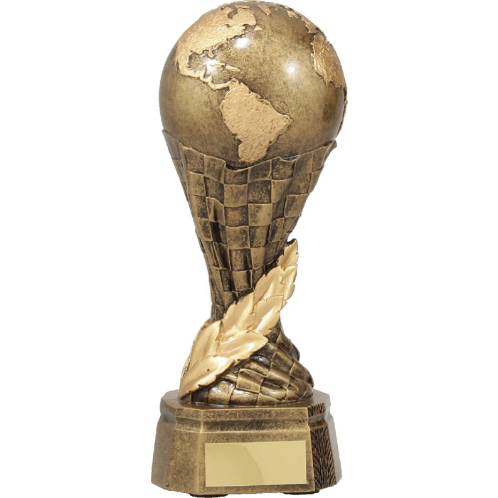 The Motorsport Raised Globe trophy features a globe raised upon a flag and wreath inspired tower. Finished in antique gold colours. These motorsport trophies are available in 3 sizes and include free engraving on a gold metal plate.