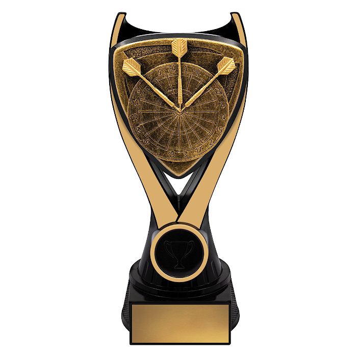 The Nova Darts trophies offer a classic approach to honour brilliance. These eye-catching awards come in three sizes (150mm, 175mm, or 200mm) and have a bold 3D motif with a sleek black and gold color combination. The price of your trophy includes the free addition of your club, school, or event logo and free engraving on a gold metal plate.