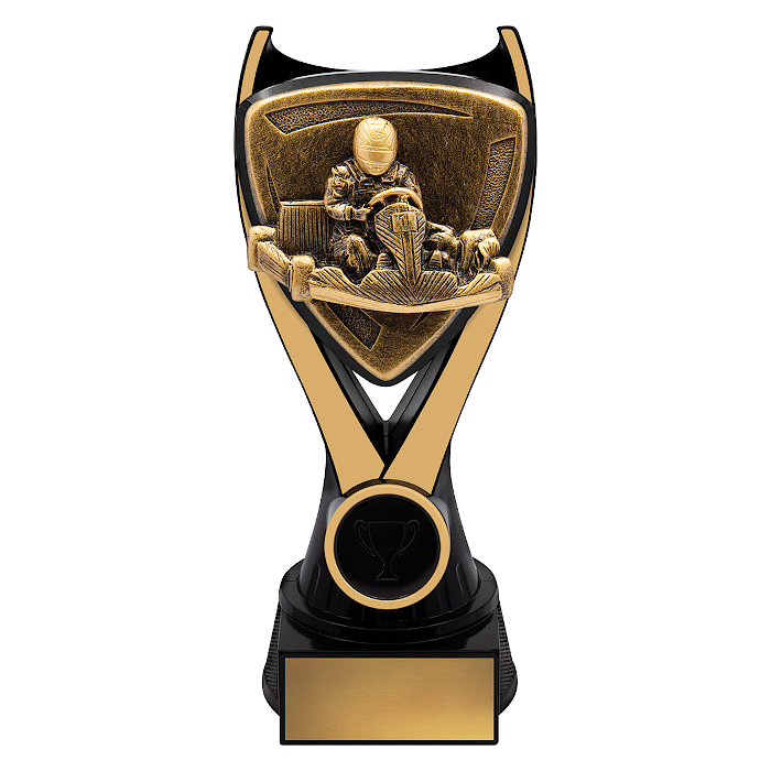 The Nova Go Kart trophies offer a classic approach to honour brilliance. These eye-catching awards come in three sizes (150mm, 175mm, or 200mm) and have a bold 3D motif with a sleek black and gold color combination. The price of your trophy includes the free addition of your club, school, or event logo and free engraving on a gold metal plate.