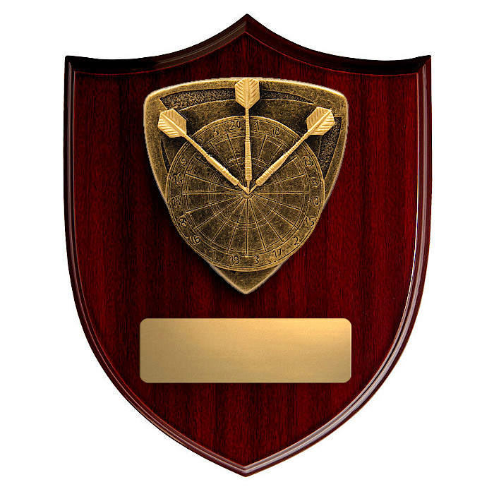 The Nova Shield Darts Award provides a nice alternative to a traditional trophy. The shield features a masterfully crafted 3D antique gold motif showcasing your chosen sport/activity. Your complimentary engraving is elegantly displayed beneath the design on a metal plate. These classic gloss rosewood shields feature both a wall mount and desk stand option on the reverse side of the award. Size: 160mm high