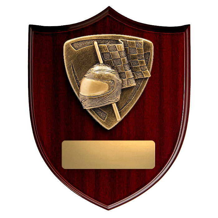 The Nova Shield Motorsport Award provides a nice alternative to a traditional trophy. The shield features a masterfully crafted 3D antique gold motif showcasing your chosen sport/activity. Your complimentary engraving is elegantly displayed beneath the design on a metal plate. These classic gloss rosewood shields feature both a wall mount and desk stand option on the reverse side of the award. Size: 160mm high