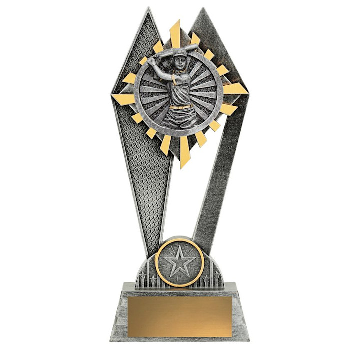 The Peak Baseball / Softball Female trophy offers superb value for such an impressive sized award! Featuring an elevated design that showcases a baseball/softball theme against a vibrant sunray style background. Available with a baseball/softball theme, male or female design. Finished in antique silver colour with gold highlights. These trophies are available in 3 sizes with space for your free club logo centre and free engraving.