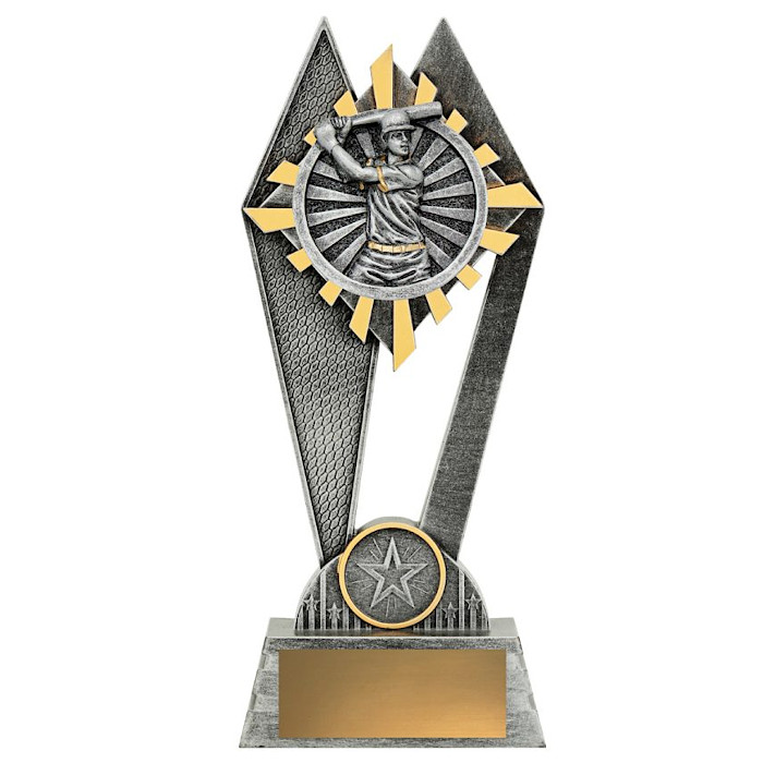 The Peak Baseball / Softball Male trophy offers superb value for such an impressive sized award! Featuring an elevated design that showcases a baseball/softball theme against a vibrant sunray style background. Available with a baseball/softball theme, male or female design. Finished in antique silver colour with gold highlights. These trophies are available in 3 sizes with space for your free club logo centre and free engraving.