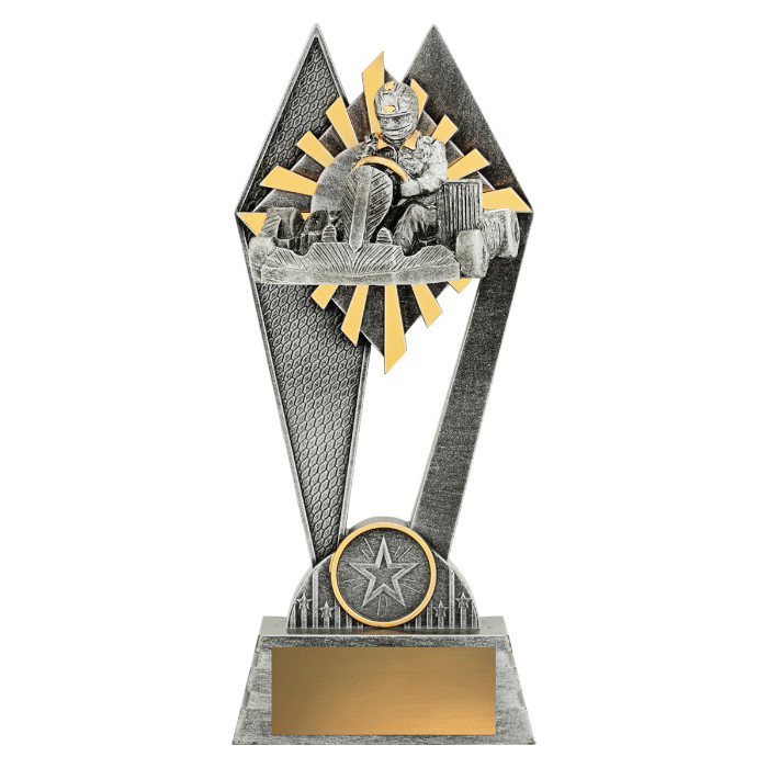 The Peak Go Kart trophy offers superb value for such an impressive sized award! Featuring an elevated design that showcases a themed motif against vibrant sunray style background. These go kart trophies are available in 3 sizes and include space for your free club logo centre and free engraving.