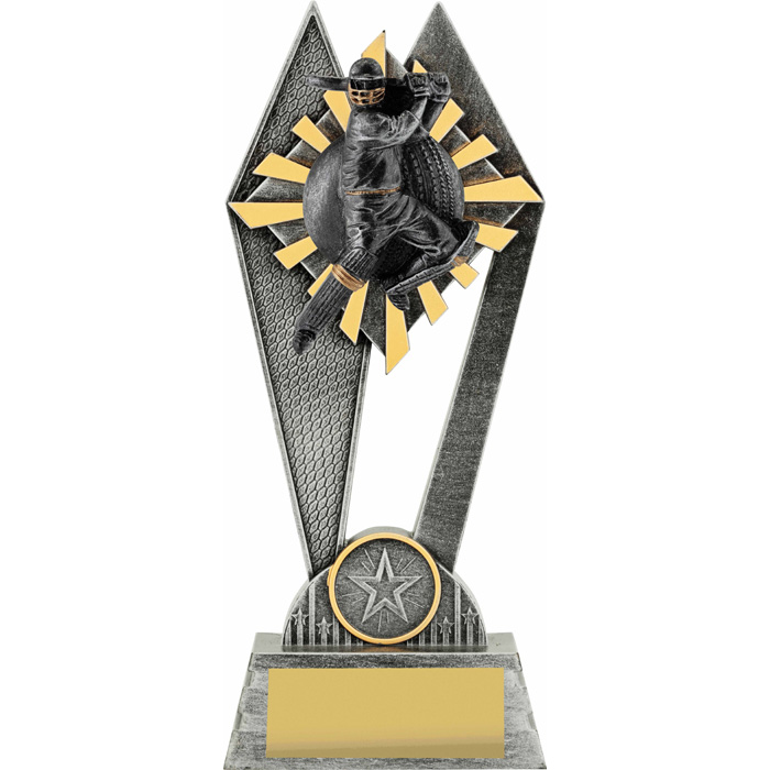 The Peak Series offer wonderful value for such an impressive size range. Featuring an elevated design that showcases a player against a vibrant sunray style background. Finished in antique silver colour with gold highlights. These cricket trophies are available in 3 sizes (male or female) with space for your free club logo centre and free engraving.