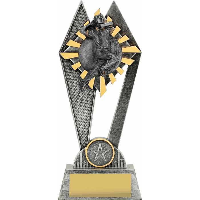 The Peak Series offer wonderful value for such an impressive size range. Featuring an elevated design that showcases a player against a vibrant sunray style background. Finished in antique silver colour with gold highlights. These cricket trophies are available in 3 sizes (male or female) with space for your free club logo centre and free engraving.
