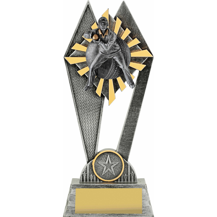 The Peak Series offer wonderful value for such an impressive size range. Featuring an elevated design that showcases a player against a vibrant sunray style background. Finished in antique silver colour with gold highlights. These cricket trophies are available in 3 sizes (male or female) with space for your free club logo centre and free engraving.
