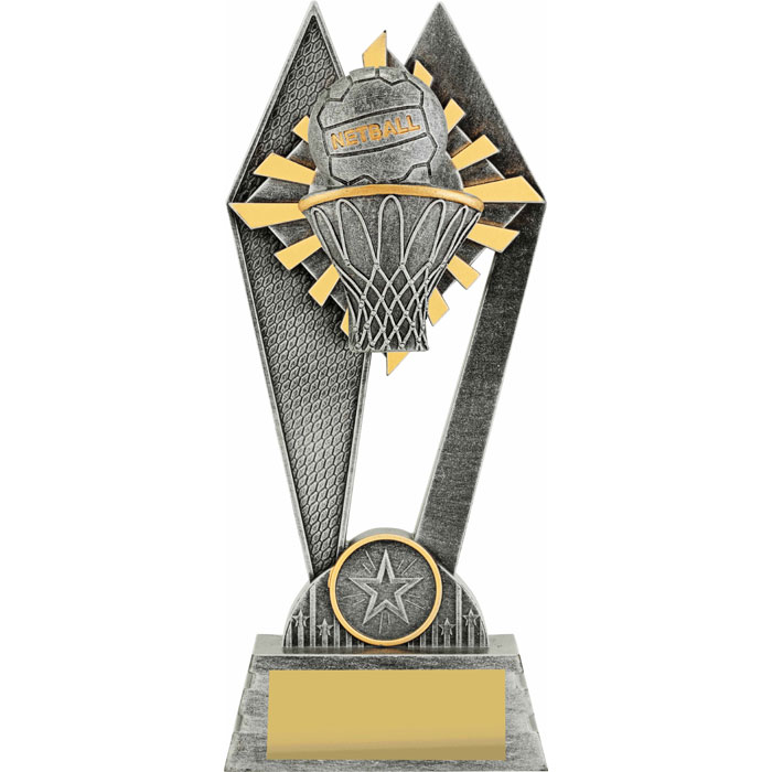 The Peak Series offer wonderful value for such an impressive size range. Featuring an elevated design that showcases a netball theme against a vibrant sunray style background. Finished in antique silver colour with gold highlights. These netball trophies are available in 3 sizes with space for your free club logo centre and free engraving.