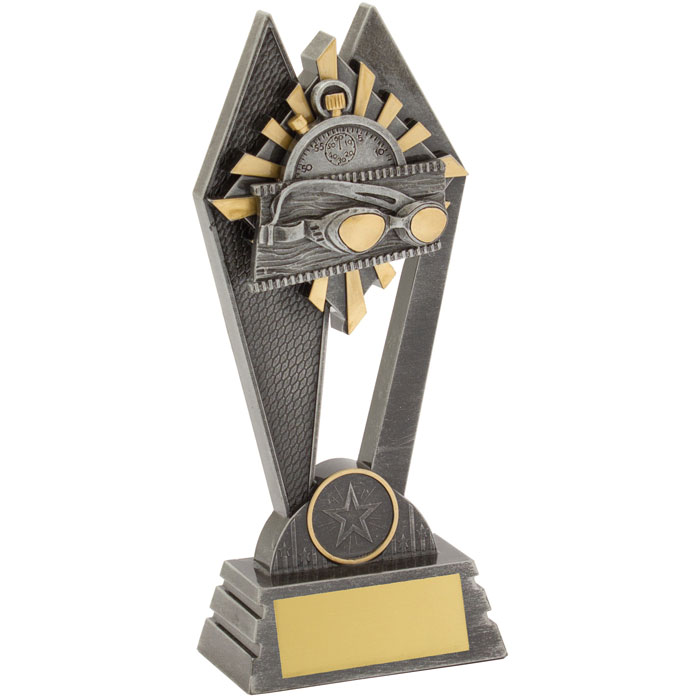 The Peak swimming trophies offer wonderful value for such an impressive size range. Featuring an elevated design that showcases a swim theme against a vibrant sunray style background. Finished in antique silver colour with gold highlights. These swim trophies are available in 3 sizes with space for your free club logo centre and free engraving.