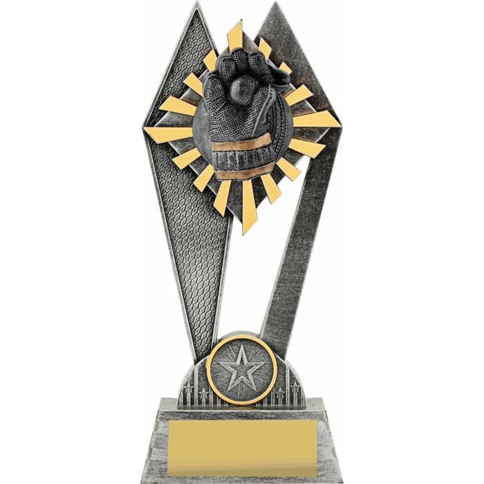 The Peak Series offer wonderful value for such an impressive size range. Featuring an elevated design that showcases a glove and ball against a vibrant sunray style background. Finished in antique silver colour with gold highlights. These cricket trophies are available in 3 sizes (male or female) with space for your free club logo centre and free engraving.