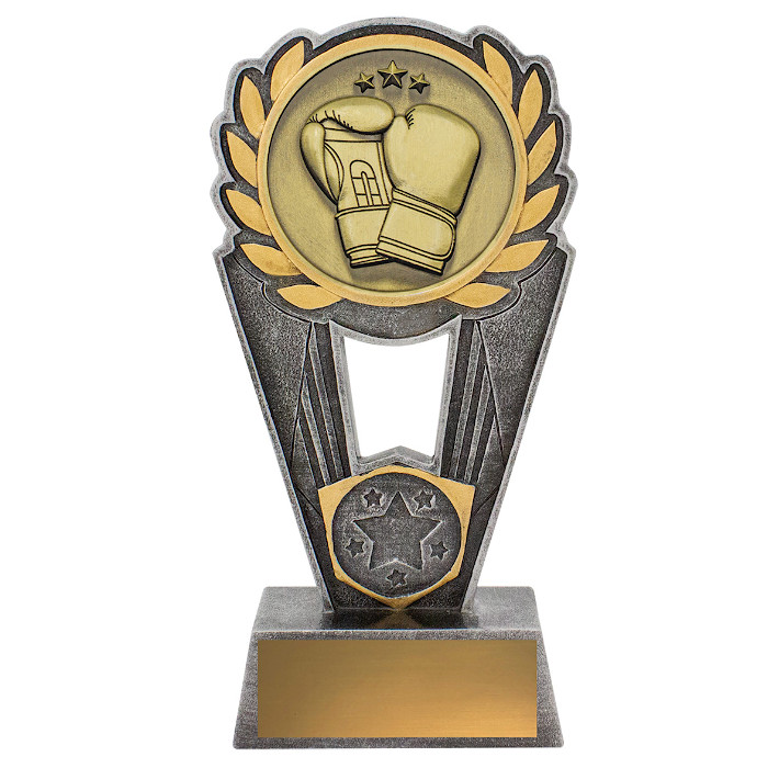 The Polaris Boxing trophy presents a striking wreath design with a finely detailed metal centre. These popular and well priced trophies are available in 3 sizes (135mm, 155mm or 175mm) and are finished in classic silver and gold colours. The price includes the free addition of your club, school or event logo and free engraving on a gold metal plate.