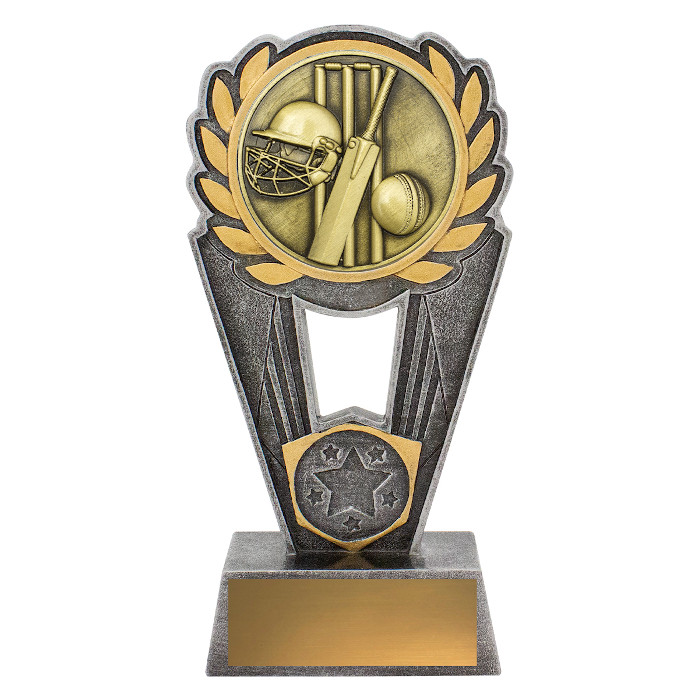 The Polaris Cricket trophy presents a striking wreath design with a finely detailed metal centre. These popular and well priced trophies are available in 3 sizes (135mm, 155mm or 175mm) and are finished in classic silver and gold colours. The price includes the free addition of your club, school or event logo and free engraving on a gold metal plate.