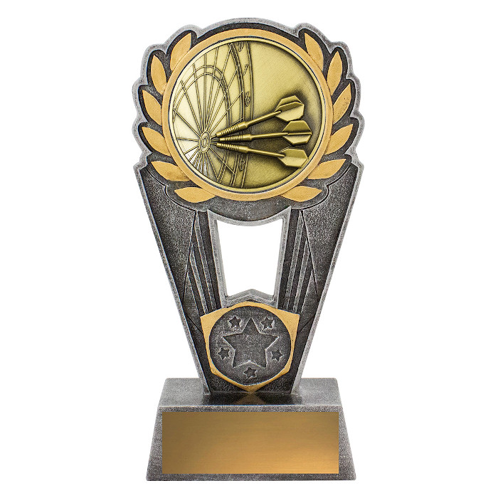 The Polaris Darts trophy presents a striking wreath design with a finely detailed metal centre. These popular and well priced trophies are available in 3 sizes (135mm, 155mm or 175mm) and are finished in classic silver and gold colours. The price includes the free addition of your club, school or event logo and free engraving on a gold metal plate.