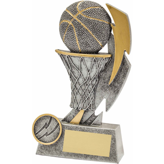 The Shazam is one of our favourites from the Basketball trophy range! Featuring a ball and net theme on a stylish lightning bolt background. Finished in traditional antique gold colours. These trophies are available in 3 sizes with space for your free club logo centre and free engraving.