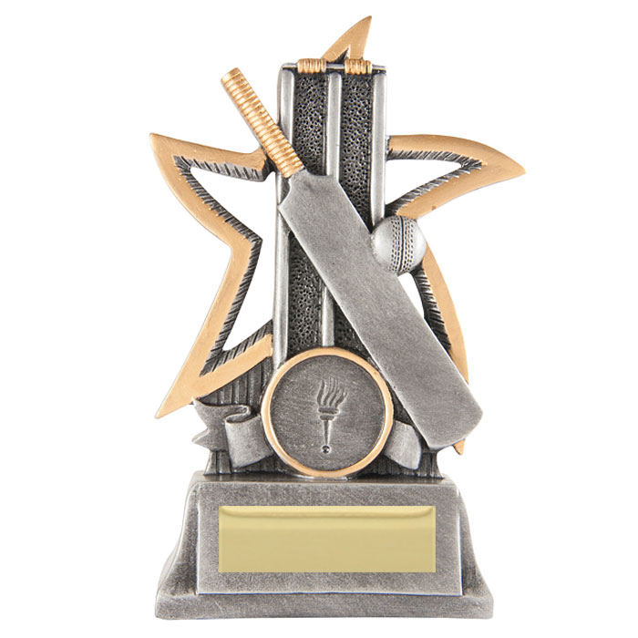 The Silver Star Cricket trophy presents a value option for your team or club participation awards. The design features wickets with bat and ball on a unique star background. Finished in antique silver colour with gold highlights. These cricket trophies are available in 3 sizes with space for your free club logo centre and free engraving.