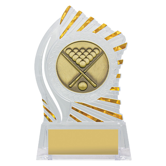 The Solar Acrylic Billiards / Snooker / Pool Awards present a terrific low-cost option that will keep your bank balance happy! These durable stand-style, acrylic awards feature a gold metal motif depicting your sport/activity and have a bright gold dazzling sunray surround. The price includes free engraving on a gold metal plate! These incredible value billiards / snooker awards are available in the following sizes: 145mm.
