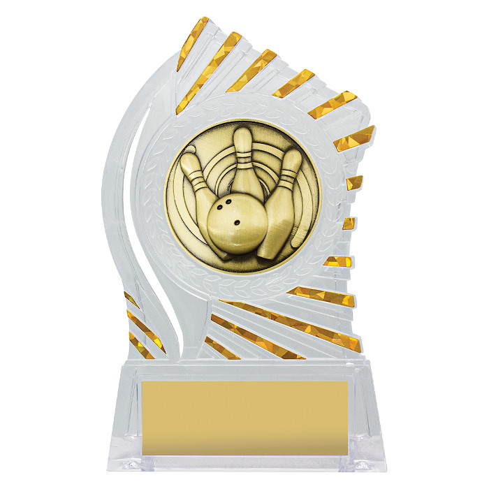 The Solar Acrylic Tenpin Bowling Awards present a terrific low-cost option that will keep your bank balance happy! These durable stand-style, acrylic awards feature a gold metal motif depicting your sport/activity and have a bright gold dazzling sunray surround. The price includes free engraving on a gold metal plate! These incredible value tenpin bowling awards are available in the following sizes: 145mm.