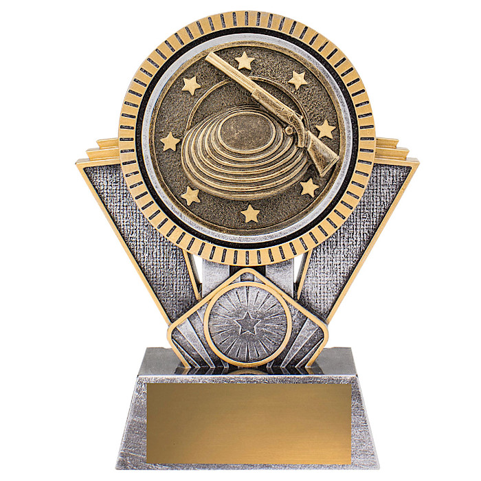 The Spartan Clay Pigeon Shooting trophy presents a striking 3D enhanced design finished in a classic antique gold and silver colour combination. These great value and durable trophies are from one of our most popular award series! They are available in 3 sizes and include space for your free school, club or event logo centre and free engraving on a gold metal plate.