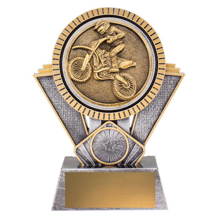 The Spartan Motorcross trophy presents a striking 3D enhanced design finished in a classic antique gold and silver colour combination. These great value and durable trophies are from one of our most popular award series! They are available in 3 sizes and include space for your free school, club or event logo centre and free engraving on a gold metal plate.