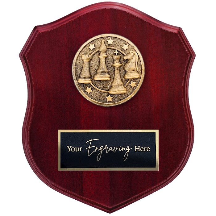 The Spartan Shields are a popular award choice. The superbly finished 3D antique gold motif offers great attention to detail. Mounted on a traditional gloss rosewood shield plaque. Your free engraving is presented beautifully on a metal plate below the motif. The reverse side of the shield features both a wall mount and desk stand option.