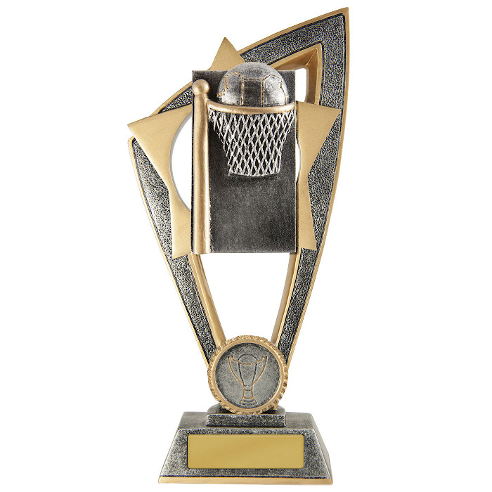 Jump in quick and snap up one of the last of these great trophies! *** 6 LEFT IN STOCK *** The Star Netball Goal trophy proudly presents an iconic netball/goal on a star inspired background. Finished in classic antique gold colours. These netball trophies are available in 1 size and include space for your free club logo centre and free engraving.