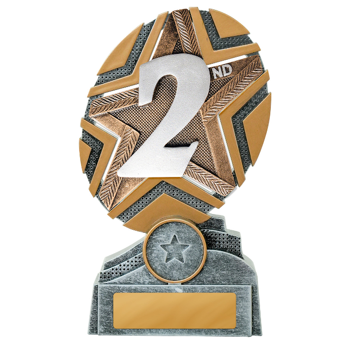 The Starburst 2nd Place / Second Place trophy presents a dazzling star-shaped design with a detailed 3D motif. These trophies are available in one convenient size (150mm). The price of your trophy includes the free addition of your club, school, or event logo and free engraving on a gold metal plate.
