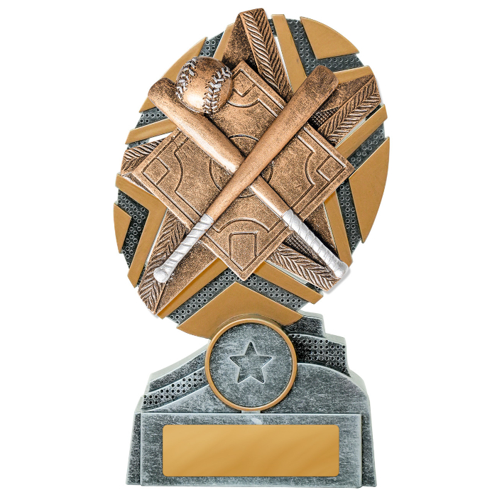 The Starburst Baseball / Softball trophy presents a dazzling star-shaped design with a detailed 3D motif. These trophies are available in three convenient sizes (130mm, 150mm, or 170mm). The price of your trophy includes the free addition of your club, school, or event logo and free engraving on a gold metal plate.