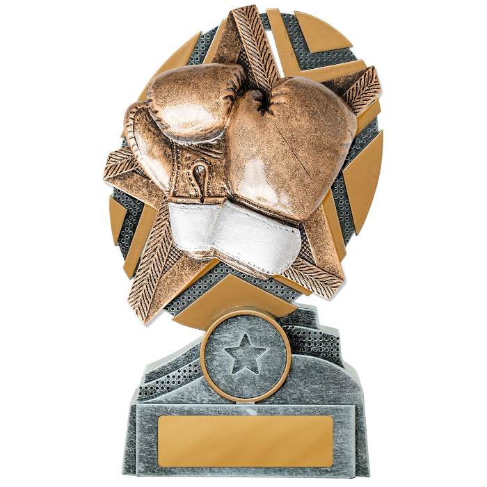 The Starburst Boxing trophy presents a dazzling star-shaped design with a detailed 3D motif. These trophies are available in three convenient sizes (130mm, 150mm, or 170mm). The price of your trophy includes the free addition of your club, school, or event logo and free engraving on a gold metal plate.