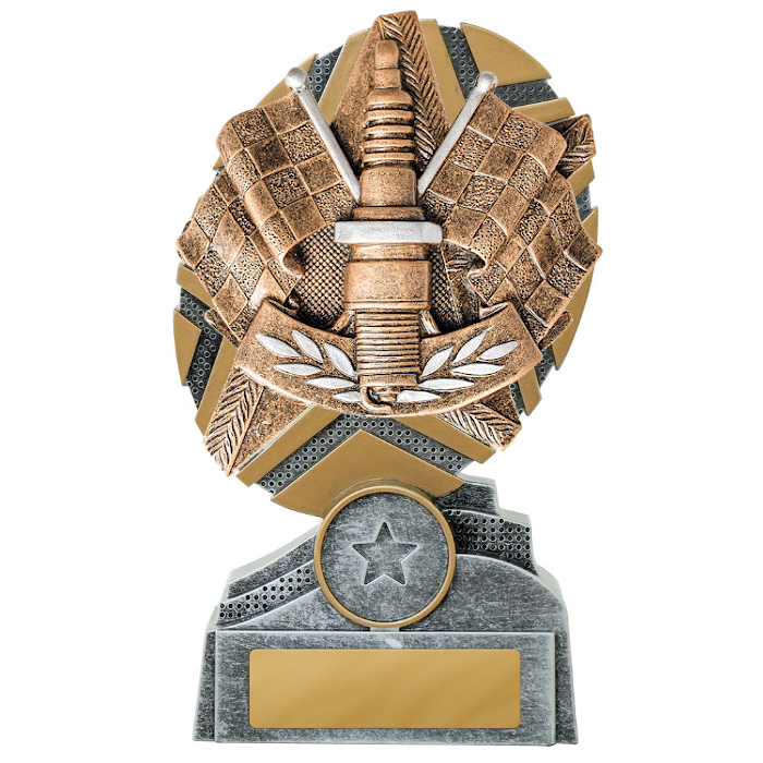 The Starburst Motorsport / Spark Plug trophy presents a dazzling star-shaped design with a detailed 3D motif. These trophies are available in three convenient sizes (130mm, 150mm, or 170mm). The price of your trophy includes the free addition of your club, school, or event logo and free engraving on a gold metal plate.