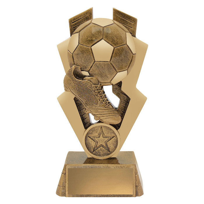 The Strike Football / Soccer trophy offers a bold gold design showcasing a ball and boot against a lightning bolt backdrop. These football trophies are available in 3 great sizes and include space for your free logo centre and free engraving.