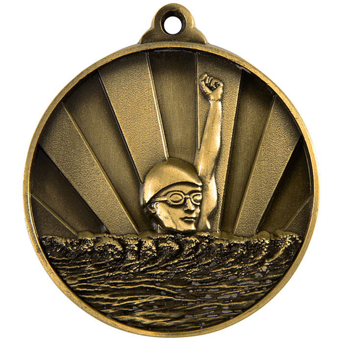 The Sunrise Swimming Medals feature an impressive 3D sunray theme. There is no compromise on quality with this well priced medal! Presented in a 50mm size finished in antique gold, silver or bronze. Each medal has space on the back for your free engraving requirements and comes with a free neck ribbon in your choice of colour.